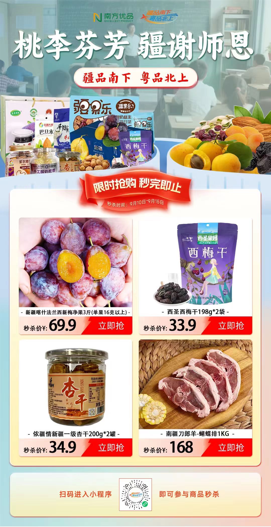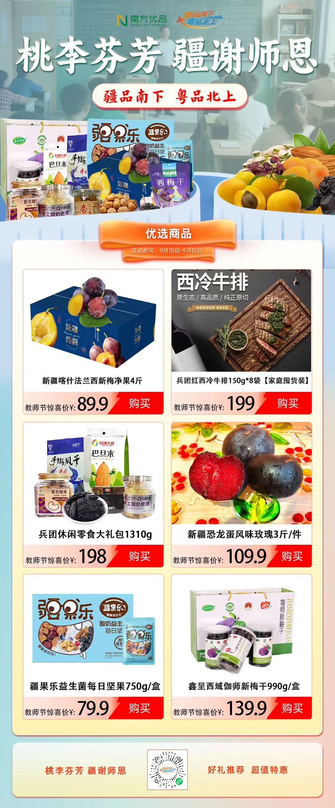 桃李芬芳,“疆”谢师恩。教会节的道理,不仅是向恩师谈一声“谢谢”,更是将这份感德化作步履,温柔更多东谈主。这个教会节,“疆品南下 粤品北上”线上主平台等您来,用一份甜礼,衔接两地的情感与温柔。